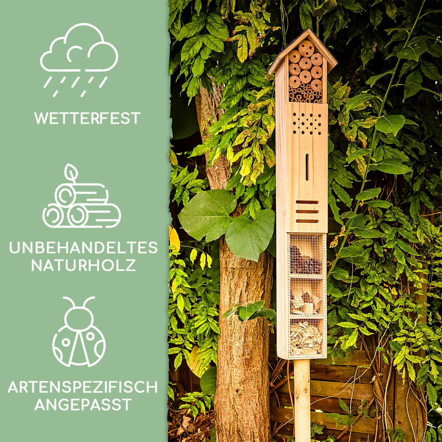 Der handgefertigte Brutkasten besitzt mehrere Hohlräume im Holz und darüber hinaus einige Bambusröhrchen, die sich als Nist- und Schlafplatz für Bienen bewährt haben. Die drei unteren Kammern sind mit Kiefernzapfen, Sägespänen bzw. Holzstückchen befüllt und locken deshalb vor allem Fliegen und Käfer an! In der Mitte befindet sich ein Schmetterlingshaus, welches den Tieren einen geeigneten Rückzugsort bietet.