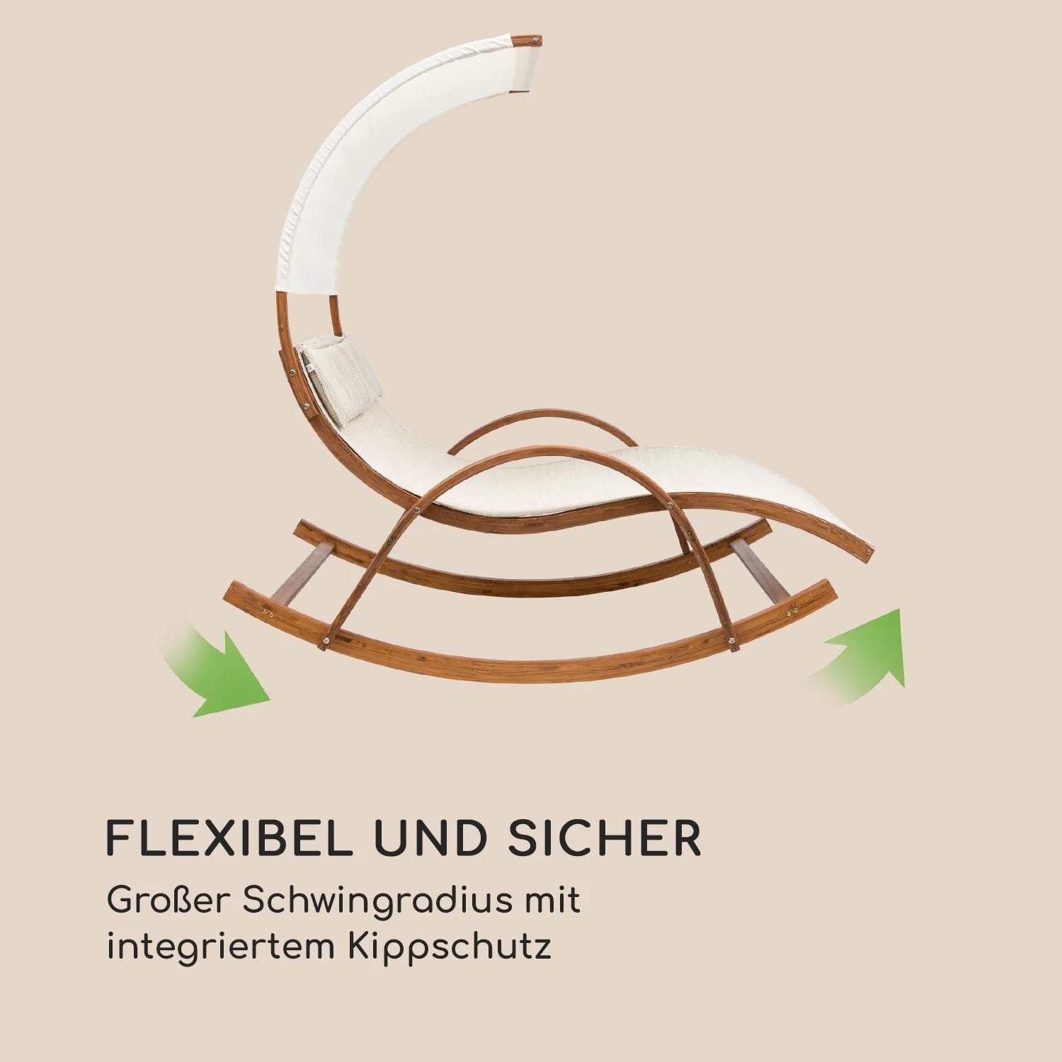 An heißen Sommertagen bietet das einfach zu verstellende Sonnendach aus Polyester verlässlichen UV- und Sonnenschutz. Darüber hinaus unterstützt der ergonomisch geformte Liegebereich die natürliche Form der Wirbelsäule und bietet eine Entspannungsfläche aus bequemem ComfortMesh, das nicht nur luftdurchlässig und wetterbeständig, sondern durch seine pflegeleichte Textilstruktur auch besonders einfach zu reinigen ist. Der stabile Rahmen aus finnischem Kiefernholz wird durch seine wasserfeste Lasur zuverlässig vor äußeren Einflüssen geschützt und ermöglicht eine maximale Belastbarkeit von 180 kg. Die sanft schaukelnde Ruhestätte fügt sich durch ihr wellenförmiges Design perfekt in jedes Gartenambiente ein und beeindruckt durch seine schlichte Eleganz.
