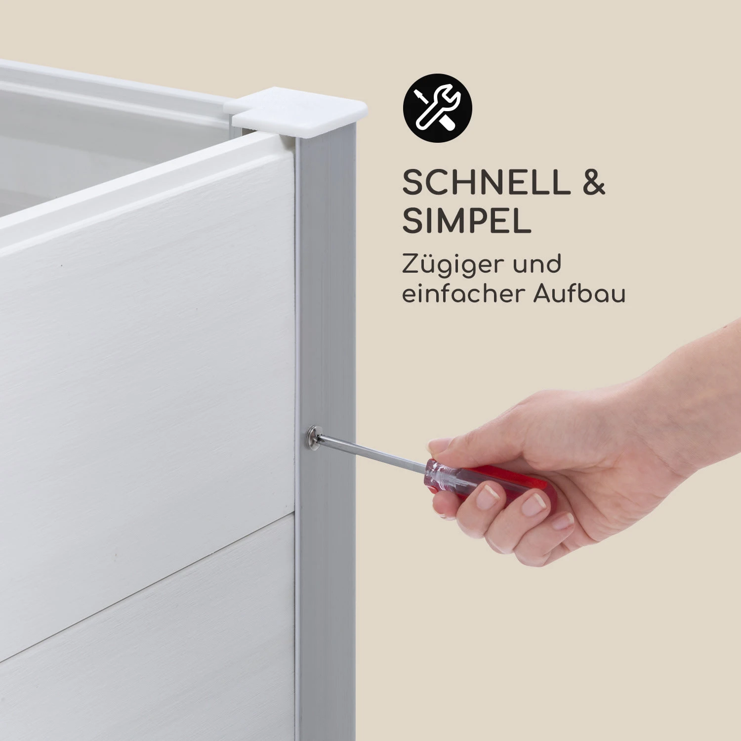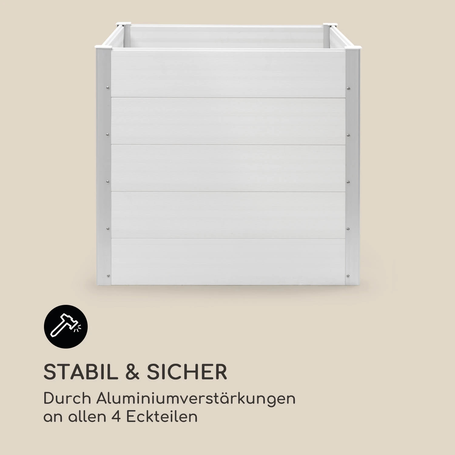 Das stabile Gartenbeet ist aus wetterbeständigem WPC (Wood Plastic Composite) gefertigt und dank UV-, Rost- und Frostschutz bestens für den dauerhaften Einsatz im Außenbereich geeignet. Mit ihrer natürlichen Holzoptik fügt sich die Konstruktion ideal in jedes Garten- und Terrassenambiente ein und wertet ihre Umgebung dank einer Farbgebung in schlichtem Weiß eindrucksvoll auf. Mit 91 cm verfügt das Nova Grow über eine besonders angenehme Höhe, die sowohl beim Bepflanzen als auch beim Ernten ein rückenschonendes Arbeiten ohne mühsames Bücken ermöglicht. Das Hochbeet kann in nur kurzer Zeit aufgebaut werden und verspricht dank Aluminiumverstärkungen an allen 4 Eckteilen eine besonders hohe Robustheit und Stabilität.