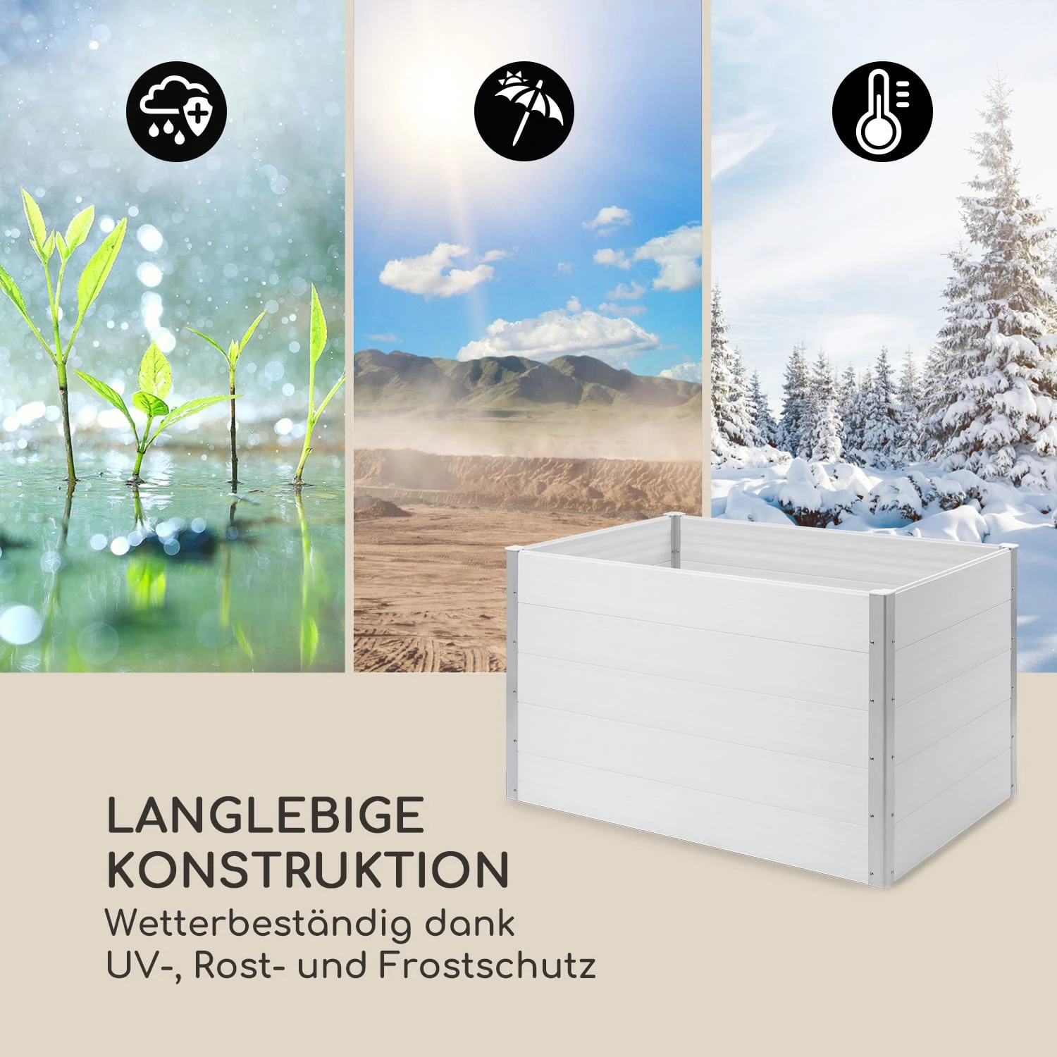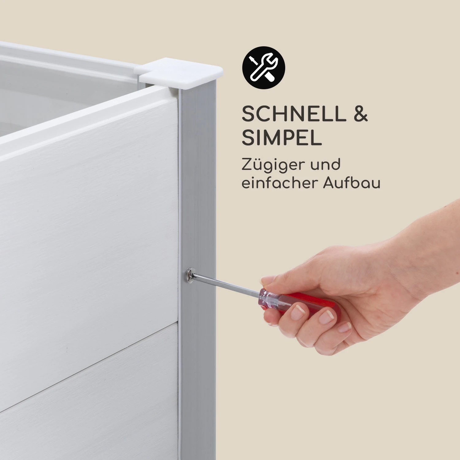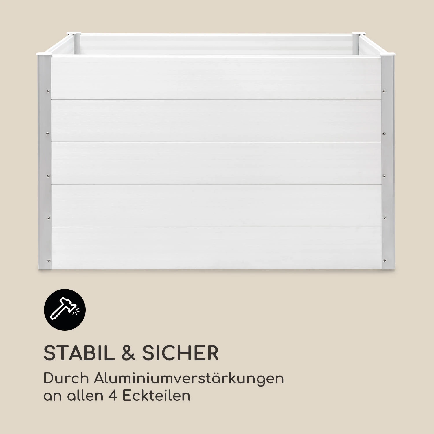 Das stabile Gartenbeet ist aus wetterbeständigem WPC (Wood Plastic Composite) gefertigt und dank UV-, Rost- und Frostschutz bestens für den dauerhaften Einsatz im Außenbereich geeignet. Mit ihrer natürlichen Holzoptik fügt sich die Konstruktion ideal in jedes Garten- und Terrassenambiente ein und wertet ihre Umgebung dank einer Farbgebung in schlichtem Weiß eindrucksvoll auf. Mit 91 cm verfügt das Nova Grow über eine besonders angenehme Höhe, die sowohl beim Bepflanzen als auch beim Ernten ein rückenschonendes Arbeiten ohne mühsames Bücken ermöglicht. Das Hochbeet kann in nur kurzer Zeit aufgebaut werden und verspricht dank Aluminiumverstärkungen an allen 4 Eckteilen eine besonders hohe Robustheit und Stabilität.
