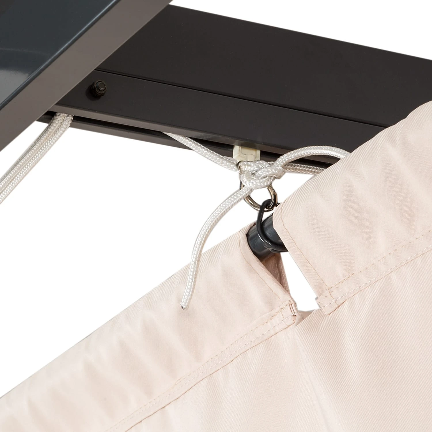 Unter dem flexiblen Dach bist du vor Regen, Wind und Sonne geschützt. Das Besondere: Es ist mit Schiebehaken am Gerüst befestigt und verfügt über ein raffiniertes Seil-System. So kannst du die Plane einfach per Seilzug ganz bequem auf- und zuziehen. Genieße Sonnenstunden ganz individuell mit offenem oder halb geschlossenem Dach!