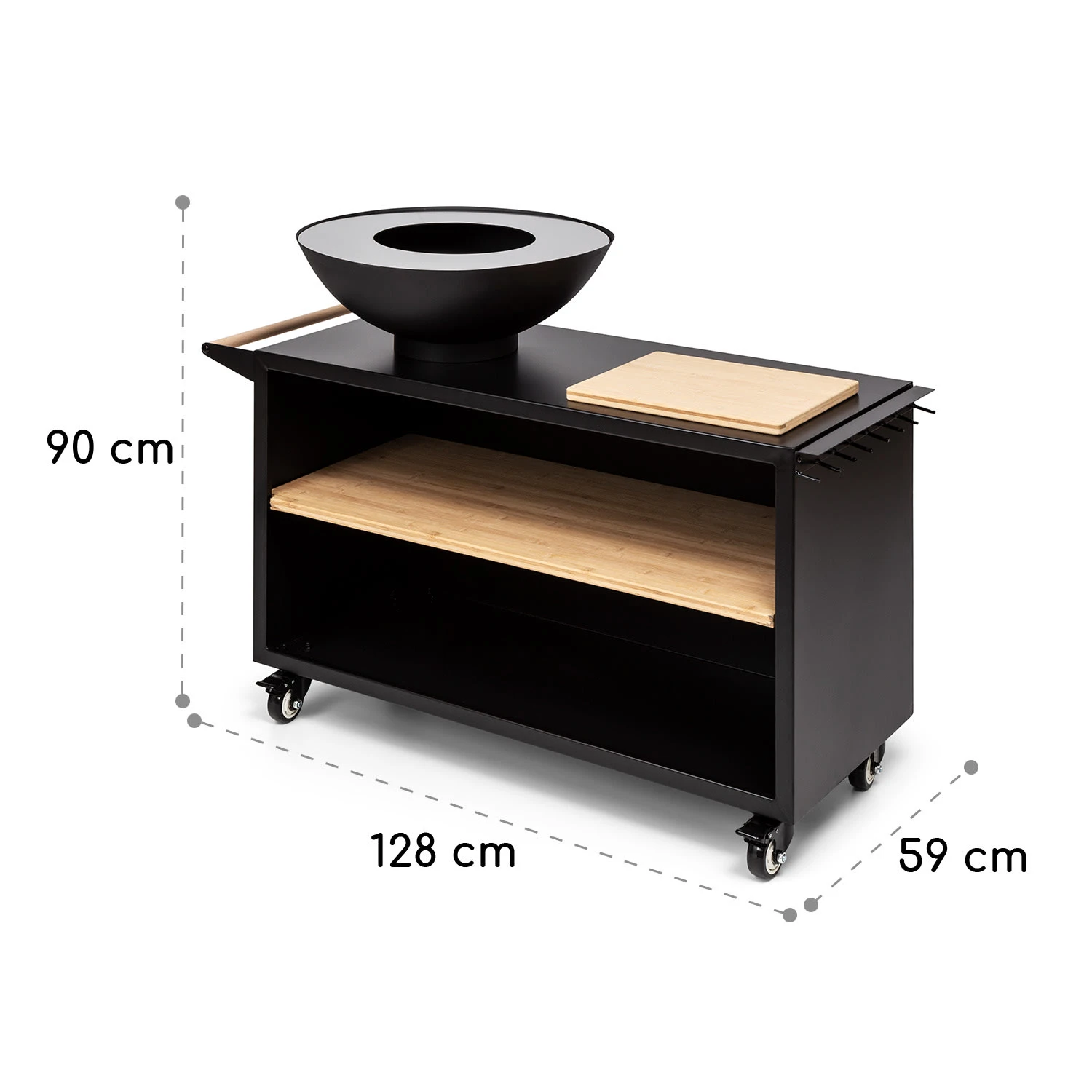 Die blumfeldt Savage 2.0 Wide Feuerschale mit Grill sorgt dank viel Stauraum und fest verbautem Bambus-Schneidebrett für knisternde Gartenatmosphäre und angenehme Grillabende unterm Sternenhimmel.