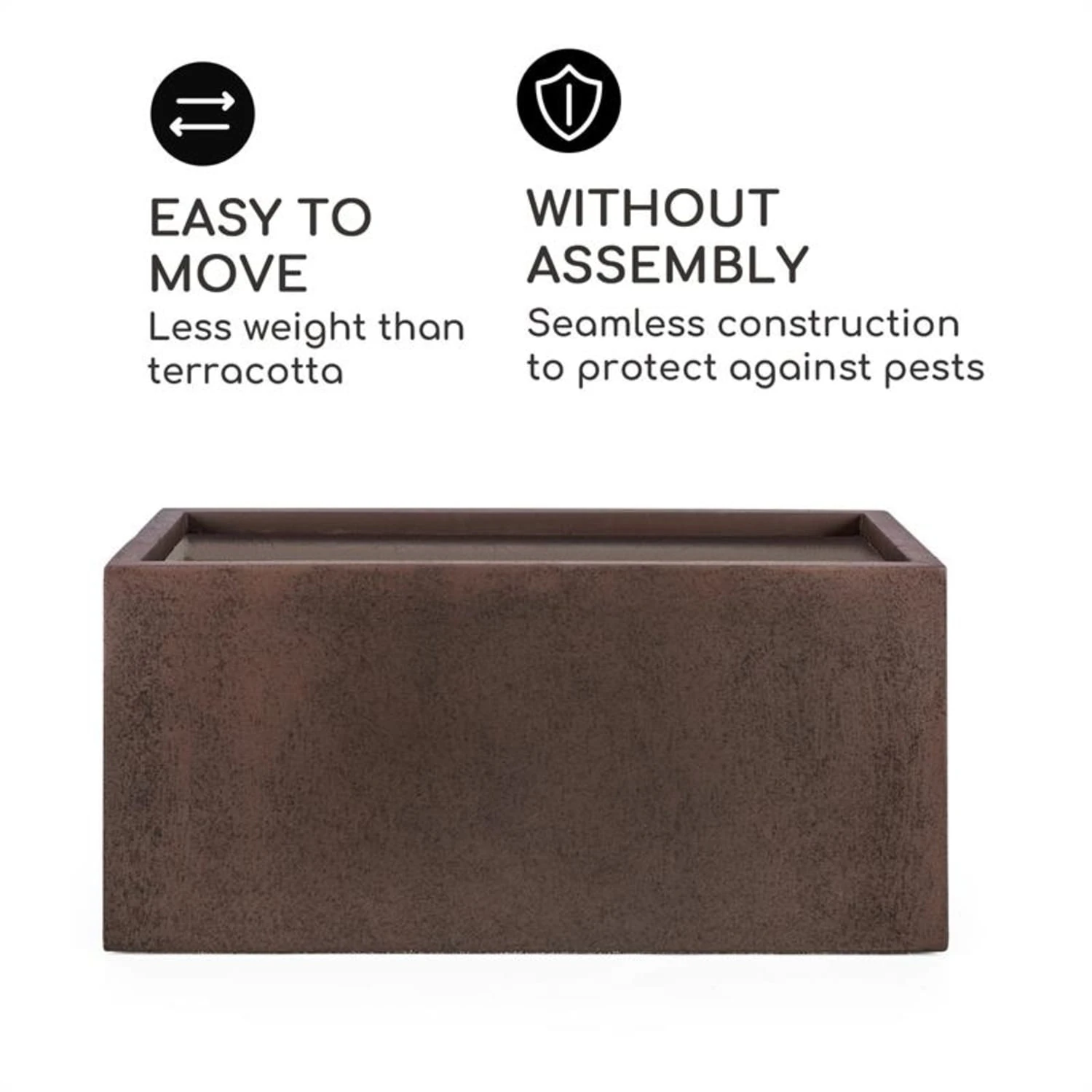 Der formschöne Pflanzkübel bietet mit seinen Maßen von 80 x 38 x 38 cm (BxHxT) ausreichend Platz für Blumen, Zimmer- und Gartenpflanzen sowie selbst angebaute Kräuter und Gemüsesorten. Dank seiner Fertigung aus robustem Fibreclay, ein besonders für Pflanzkästen geeignetes Gemisch aus Fiberglasmatte und Ton, ist der Solid Grow Rust nicht nur witterungsbeständig, sondern auch gegen UV-Strahlung und Frost geschützt. Er kann somit auch ganzjährig im Freien eingesetzt und aufbewahrt werden. Ein anderer Vorteil des Materials ist sein relativ geringes Gewicht, was sowohl das Versetzten als auch den Transport des Pflanzkübels deutlich erleichtert. Durch seine Rostfärbung und seinen natürlichen sowie rustikalen Look fügt sich der Solid Grow Rust zudem ideal in jedes Garten- und Wohnambiente ein.