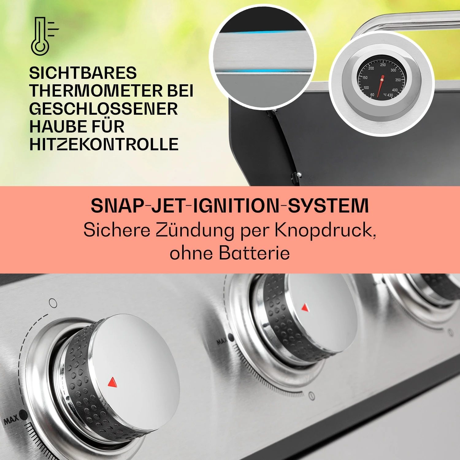 Starke Hitze ohne Rauch, mit dem Klarstein Tomahawk Gasgrill kein Problem. Fünf Brenner mit je 3,6 kW Leistung sowie ein zusätzlicher Wok-Brenner mit 2,7 kW Leistung sorgen für anständig Hitze unter dem Grill. Dank SnapJetIgnition System mit batterieloser Piezozündung werden sämtliche Brenner bequem und augenblicklich per Knopfdruck gestartet. Der Gasgrill bietet sich mit seinem gusseisernen Grillrost von 80 x 43,5 cm für verschiedenstes Grillgut an: herzhafte Steaks, knackige Würste, leckeres Grillgemüse oder saftiger Fisch. Mit der großen, doppelwandigen Edelstahl-Haube sind auch Spezialitäten des passiven Grillens wie Pulled Pork oder Spare Ribs kein Problem.